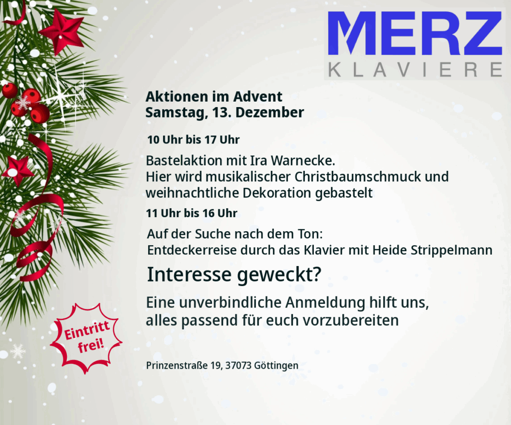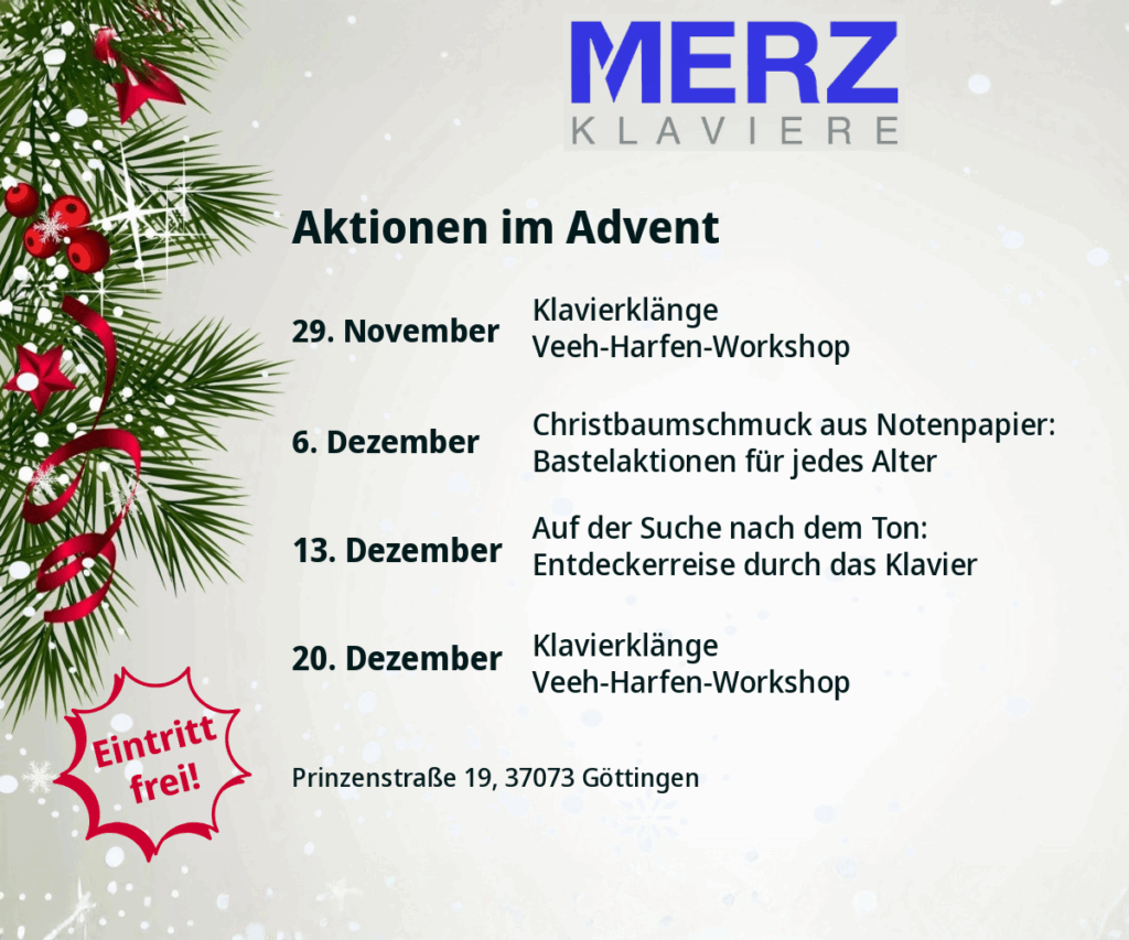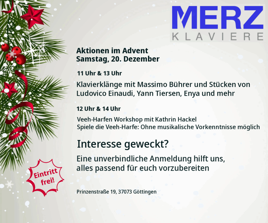 Wir, das Team von Merz Klaviere, freuen uns darauf, mit euch gemeinsam die Adventszeit auf musikalische Weise zu feiern – mit Herz, Klang und einer Prise Weihnachtszauber.